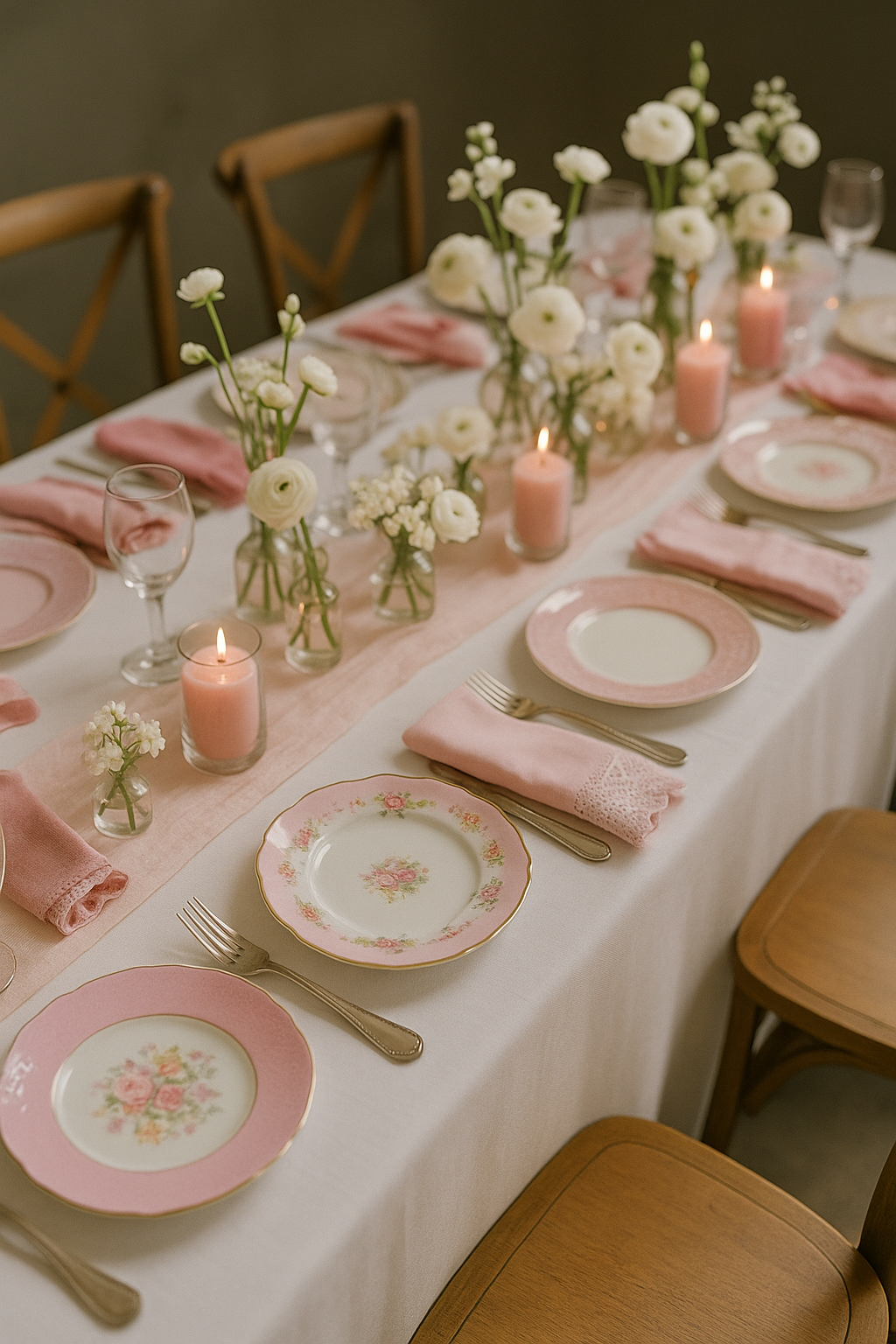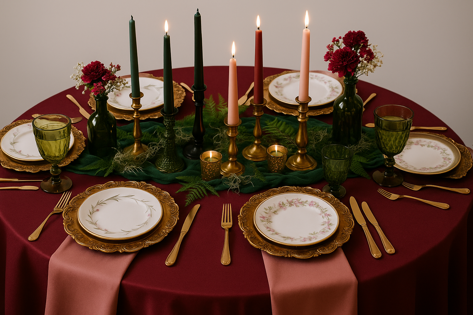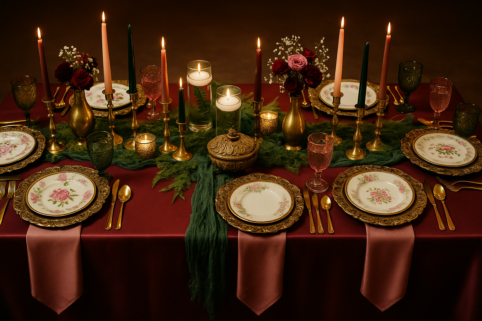 This is a gallery of AI-generated mockups for table designs. I use AI to help myself and my clients visualize how we could combine the pieces we have to create a beautiful tablescape.